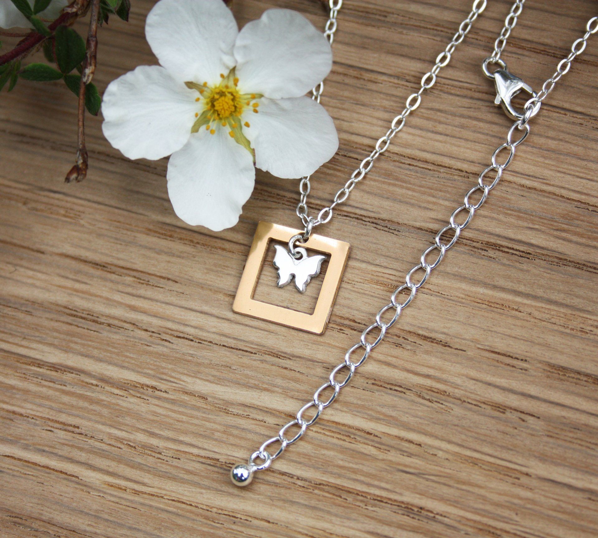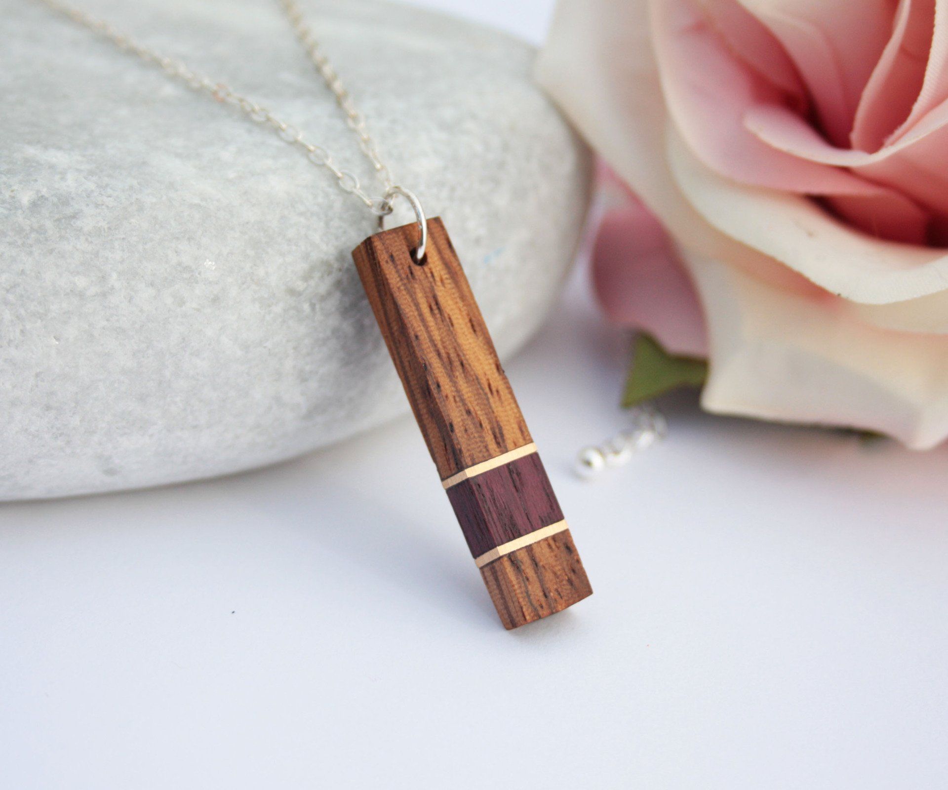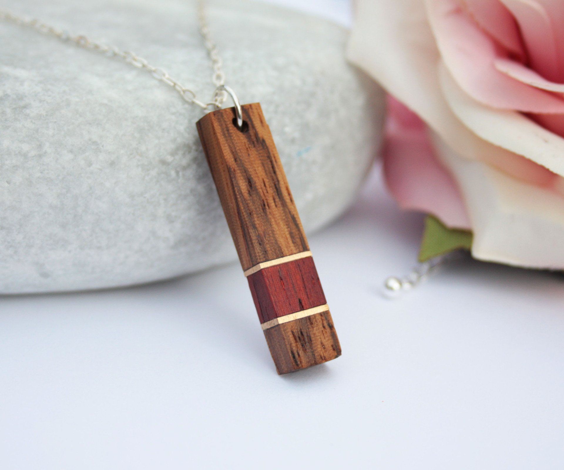 African Padauk, Zebrano and Gilding Brass Exotic Hardwood Necklace on Sterling Silver Chain
